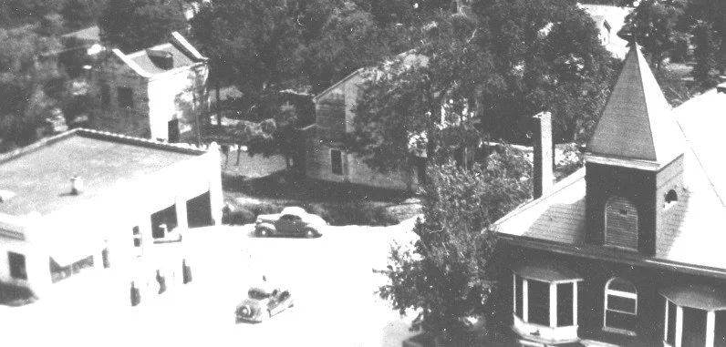 photo from the mid-to-late-1930s was taken from the top of the old courthouse, showing the old jailhouse to the left, the Sheriff’s residence center, and the old City Hall to the right. The jail yard was the setting for one of the last public hangings in Missouri.